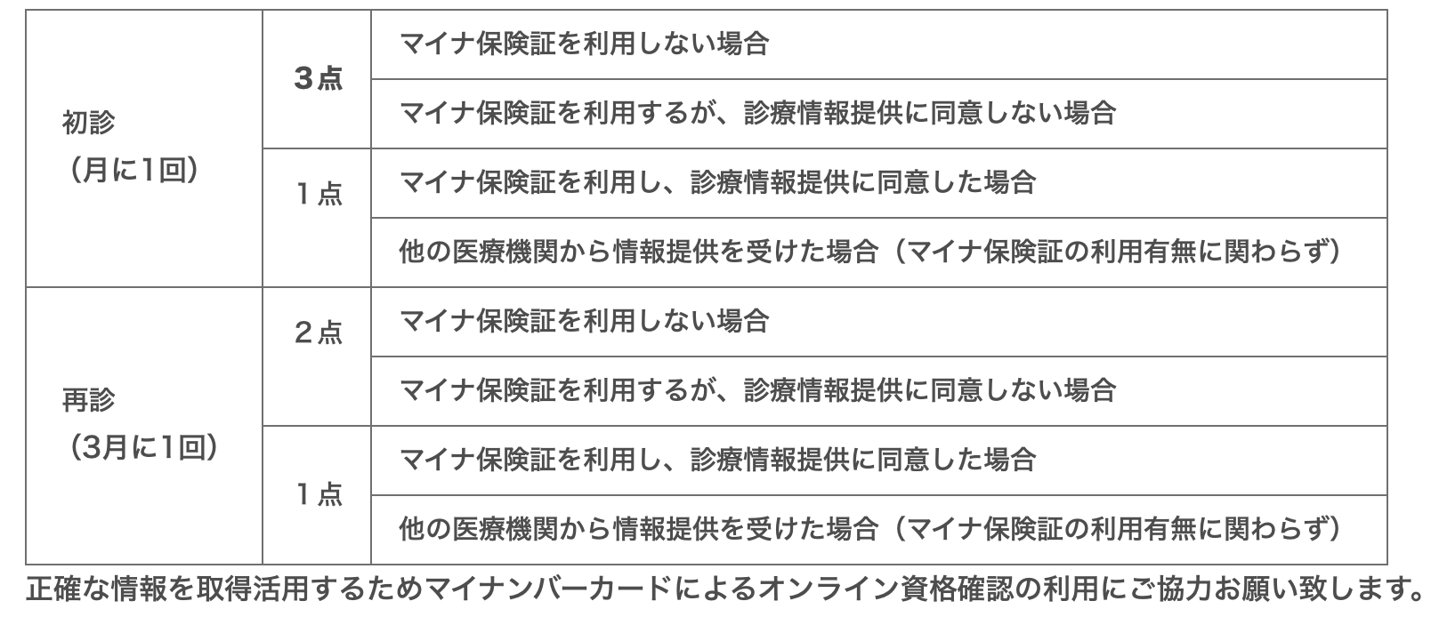 以上の体制により、医療情報取得加算として、以下の点数の算定を行なっております。